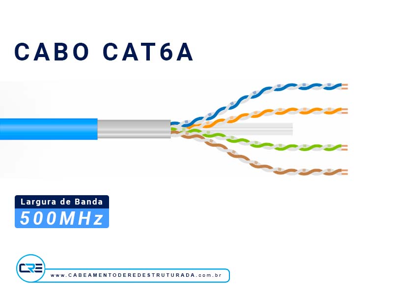 Com largura de banda de 500Mhz, o cabo de rede Cat6A (Categoria 6a, onde o “A” significa “Augmented” ou “Aumentado”) é um tipo de cabo de rede com versão aprimorada e de alta performance do cabo Cat6. Ele foi projetado para ser o padrão de fato para redes de até 10Gbps, suportando maior alcance em longa distância, superando a principal limitação do Cat6 — isso se deve ao fato da espessura do cabo ser maior com 23AWG, da quantidade de trança dos pares, do divisor dos pares interno e da capa de alumínio que envolve todos os pares juntos. Lançado no final de 2008, o cabo de rede Cat6A (Categoria 6 Aumentada) é a evolução do Cat6, projetado para resolver a sua principal limitação. Enquanto o Cat6 só conseguia alcançar 10 Gbps em distâncias curtas (até 55 metros), o Cat6A foi o primeiro cabo de rede a garantir o padrão Ethernet 10GBase-T em sua distância total de 100 metros. Para atingir essa performance, o Cat6A dobrou a largura de banda de seu antecessor, operando a uma frequência de até 500 MHz. Estruturalmente, ele manteve o divisor central, mas foi aprimorado com uma blindagem mais robusta para combater o Alien Crosstalk (a interferência de cabos vizinhos em ambientes de alta densidade). O Cat6A se tornou a escolha preferencial para aplicações de missão crítica em data centers e redes de backbone, mantendo a compatibilidade e a facilidade de uso do conector RJ45.