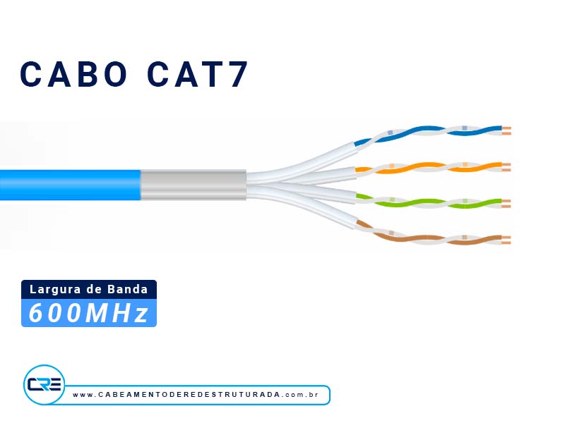 Com largura de banda de 600Mhz, o cabo de rede Cat7 (Categoria 7) é um tipo de cabo de rede com par trançado, projetado para redes estruturadas que exigem altíssimo desempenho, com velocidades e larguras de banda superiores às do Cat6A. No entanto, é um produto com um histórico particular de padronização, o que o torna menos comum em mercados como o brasileiro. Com velocidade de até 100Gbs em distâncias curtas e até 40Gbs em distâncias maiores, sua estrutura possui blindagem mais robusta. Possui blindagem individual dos 4 pares de fios em folha de alumínio e blindagem em malha que envolve todos os pares, este cabo de rede é do tipo S/FTP. O cabo de rede Cat7, a sétima geração de cabos Ethernet, foi projetado para ter altíssimo desempenho, superando o Cat6A em termos de frequência e blindagem. Sua norma, desenvolvida pela ISO/IEC, introduziu mudanças importantes na contrução e sua estrutura. O Cat7 é principalmente diferente do Cat6A por três motivos principais: 1- Blindagem obrigatória: O cabo de rede Cat7 é sempre um cabo blindado. Ele possui uma blindagem interna obrigatória em cada par trançado, além de uma blindagem geral ao redor de todos os pares, o que o torna extremamente resistente a interferências externas e internas. 2- Frequência aumentada: O cabo de rede Cat7 trabalha com frequência de operação para até 600 MHz, um salto significativo em relação aos 500 MHz do Cat6A, o que permite maior capacidade de transmissão de dados. 3- Velocidade e alcance: O cabo de rede Cat7 mantém a capacidade de suportar o padrão 10GBase-T, ou seja, uma velocidade de 10 Gigabits por segundo, em sua distância total de 100 metros. Um ponto crítico a ser compreendido é o conector. A norma oficial do Cat7 exige o uso de conectores específicos (como GG45 e TERA), que foram projetados para complementar sua alta performance e não são compatíveis com o conector RJ45 padrão. Embora cabos Cat7 sejam vendidos com conectores RJ45 para compatibilidade, essa prática pode comprometer o desempenho máximo da categoria. O Cat7 é utilizado principalmente em data centers e ambientes profissionais de alta densidade. No entanto, sua utilização não é generalizada, especialmente no mercado sul americano, que segue a norma TIA/EIA e prioriza o Cat6A para 10 Gbps e o Cat8 para velocidades superiores.