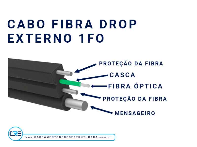 O cabo de fibra óptica externo do tipo Drop, foi desenvolvido para suportar sol e chuva. Ele pode ficar suspenso e esticado graças ao mensageiro que é um arame interno mais espesso comparado aos seus arames de proteção.