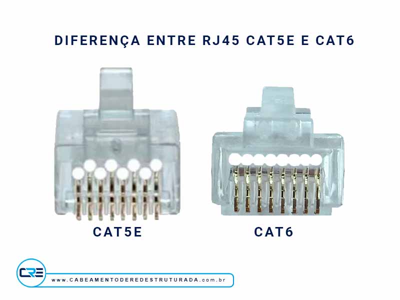 A construção e estrutura dos conectores Cat5e e Cat6 é diferente. O conector RJ45 Cat6, possui maior espaço entre as conexões para que o cabo de rede Cat6, atinja seu desempenho superior, observe na imagem abaixo: