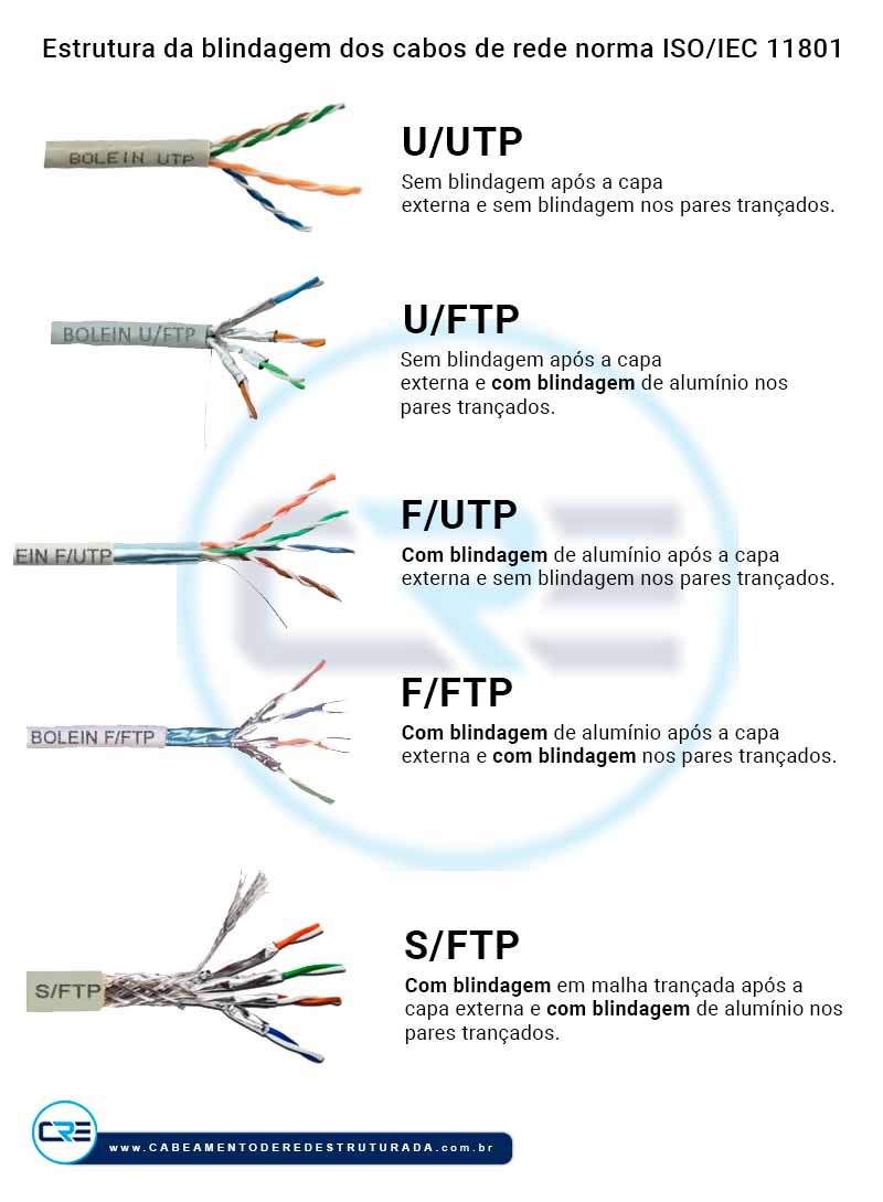 A estrutura do cabo de rede se resume em dois tipos: somente com as capas ou o cabo com diferentes tipos de blindagens. Criado pelo padrão internacional ISO/IEC 11801, define a nomenclatura para a estrutura e blindagem do cabo de rede: